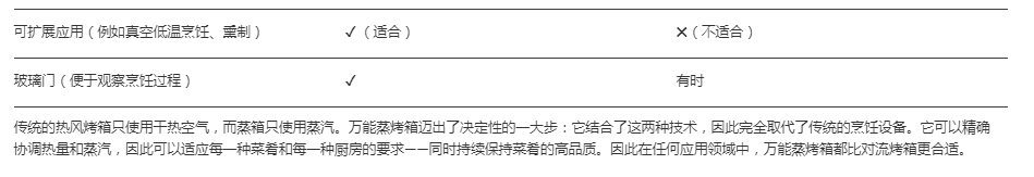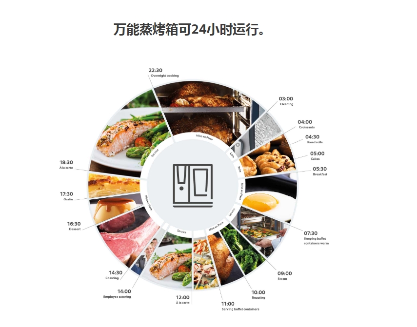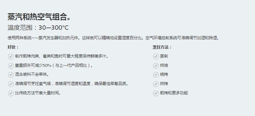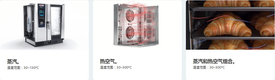新鮮蒸汽被連續(xù)輸送到烹飪室,再加上熱空氣,這樣就可以在一臺烹飪系統(tǒng)中實現(xiàn)多種烹飪技術:蒸制、烘焙、燒烤、烘烤、煎烤等。因此,廚師只需一臺烹飪設備就能應用各種不同的烹飪方法。