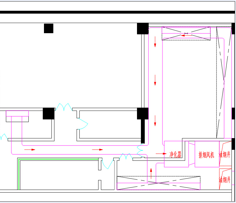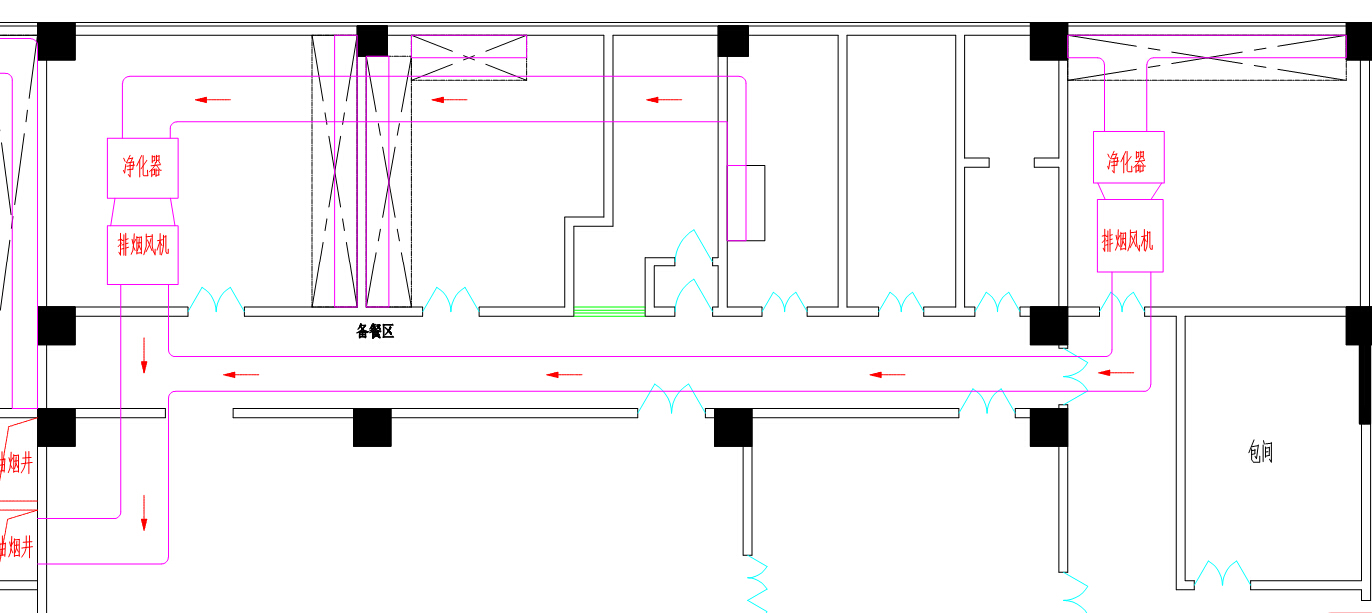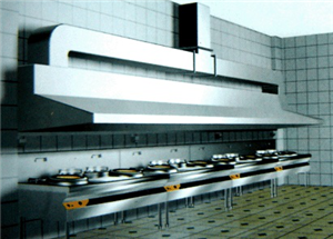 廚房排煙系統(tǒng)屬于強(qiáng)排煙,為了能夠保證排煙的順暢,需要排煙風(fēng)柜將排煙罩處保持在負(fù)壓的情況下(壓差在一個(gè)大氣壓以上),才能將油煙順暢的排出室外。根據(jù)廚房設(shè)備的布局情況,一樓排煙系統(tǒng)設(shè)有三組排煙,二樓排煙系統(tǒng)設(shè)有二組排煙,每組排煙都具有獨(dú)立的排煙風(fēng)機(jī)、凈化系統(tǒng)及排煙管道。