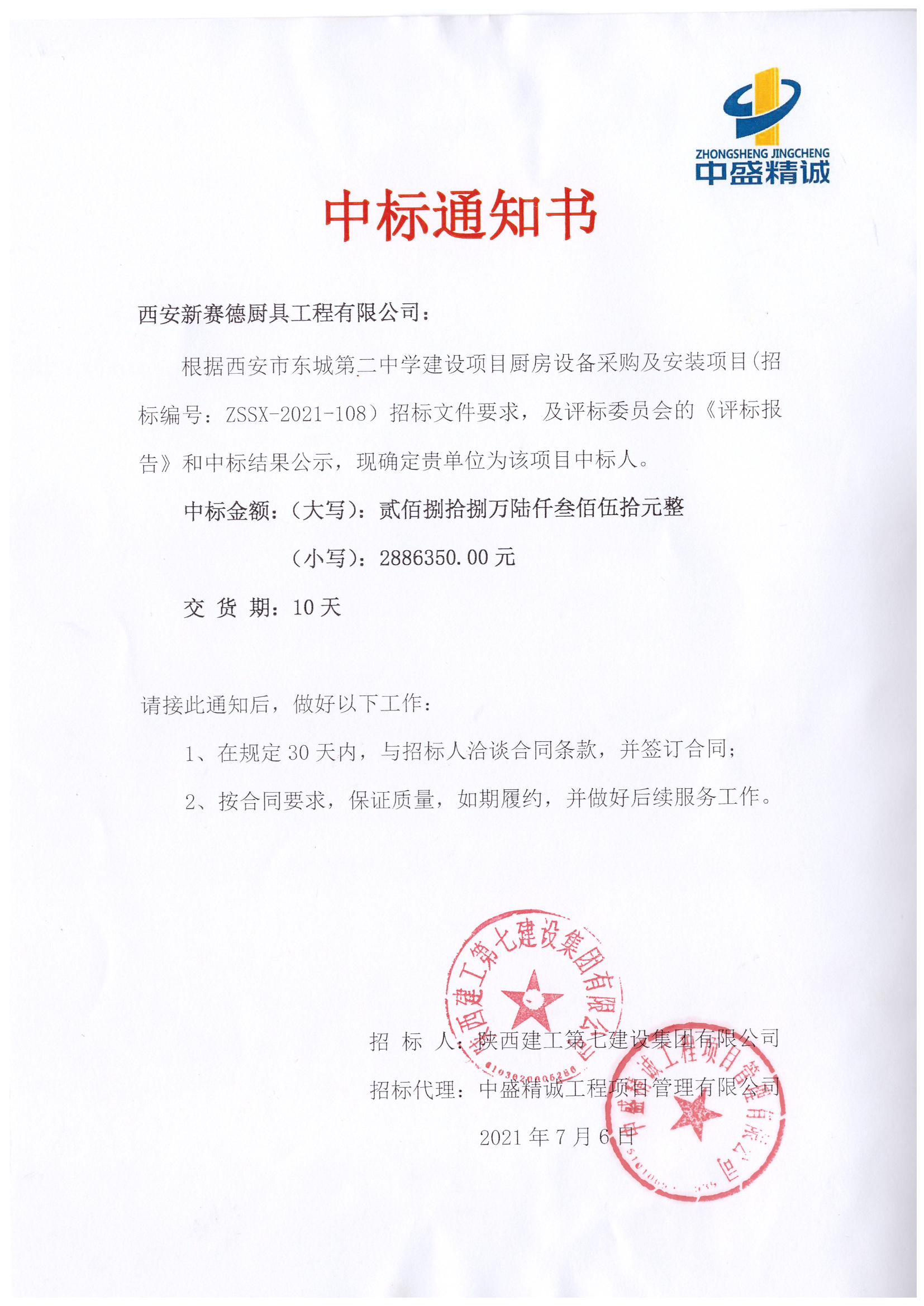 喜訊:西安新賽德廚具工程有限公司2021年7月6日--東城二中中標(biāo)通知書(shū)